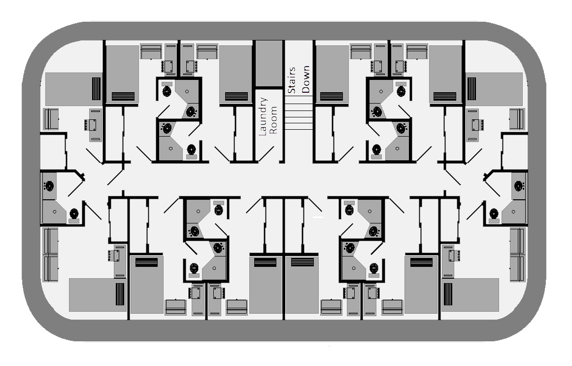 As drawn there are two living groups of modules opposite each other, that is across the diameter of the ring from each other. The remaining modules are agricultural modules. There is one cafeteria module for each side. This module has the main floor devoted to the kitchen and eating area, roughly 50% each. The kitchen is divided into two parts with the center aisle between.