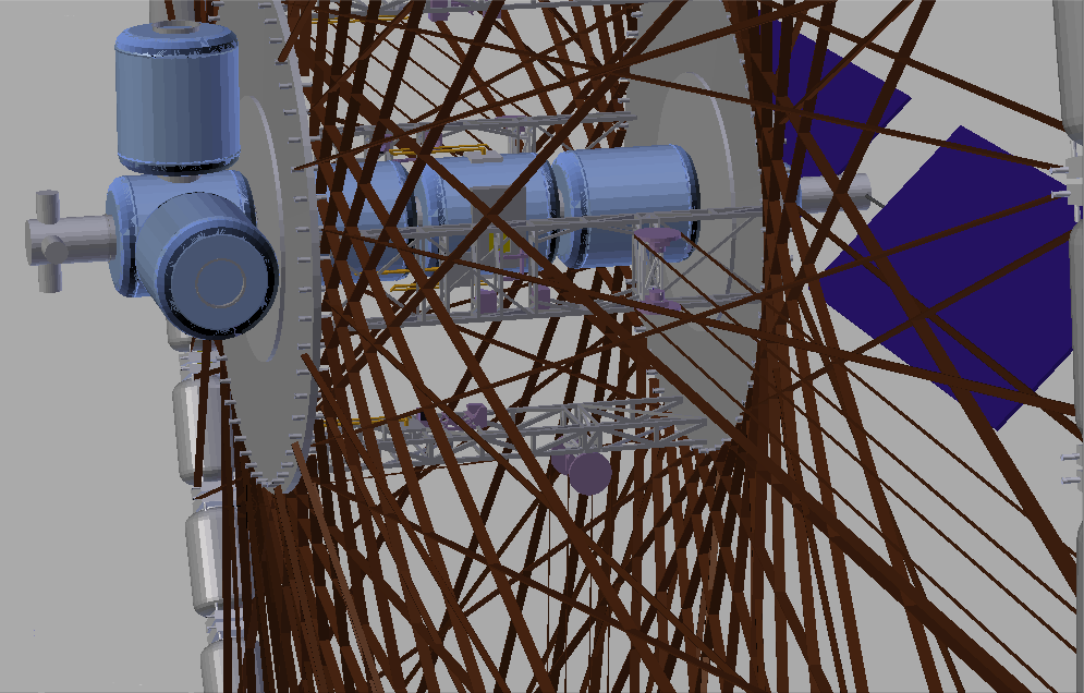 The rim modules are based on the Bigelow designs, but structually different as they are intended to support a 1g environment. I call them BA1400 to give an indication of size. These are 18m long and 10.6m id and 12m outside diameter. These modules would be built with floors, walls and as much support equipment for ECLSS, water, oil balast, pumps, plumbing, electrical etc., all pre-installed on Earth before being launched. This means that the modules must be pre-expanded, not launched in compressed format like the Bigelow BA330 and BA2100 designs. These will require new larger fairings for Starship rockets, bigger than the current upper payload area of Starship, but I believe this is just an engineering exercise and these modules should not exceed the mass capability of the rockets.
